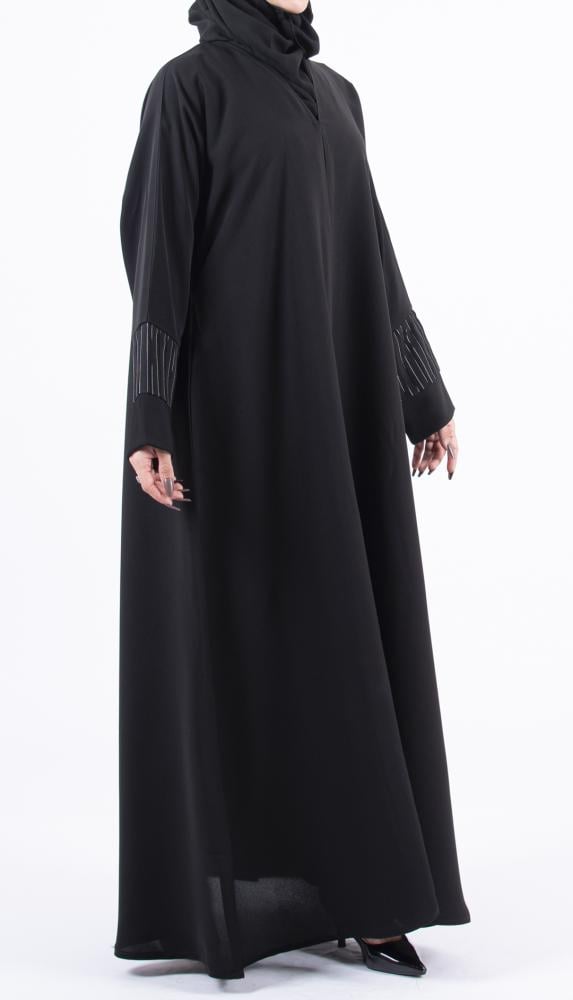 - وصف: عباية تجمع بين التصميم الكلاسيكي والتفاصيل العصرية، مزينة بكلفة مخططة على الأكمام لتضيف لمسة من الجاذبية، مثالية للمناسبات الرسمية وغير الرسمية.