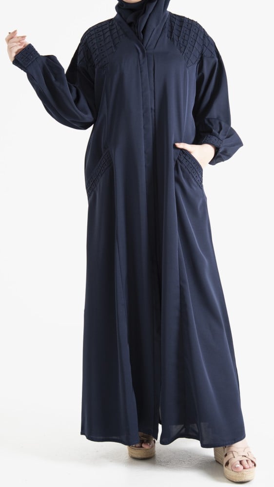 نوع العبايه : عبايـــــه كتـــف جيوب باللون الكحلي بتطريز تاعن على الأكتاف والجيب